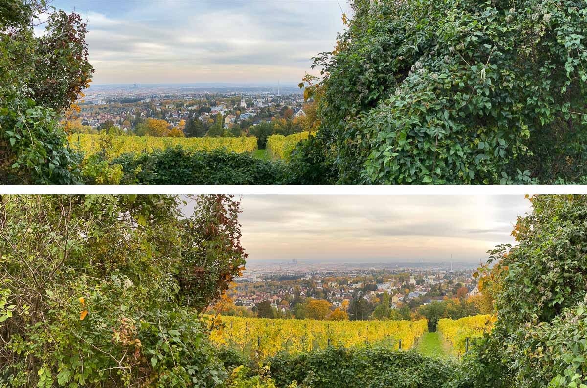Wenn du mit dem Handy ein Schwenkpanorama machst, dann bedenke, dass die Farben und Helligkeit stark von der Startposition (links oder rechts) abhängen können. Gerade, wenn etwas einfärbiges (grüne Blätter) am Rand sind. Hier ein herbstliches Beispiel: