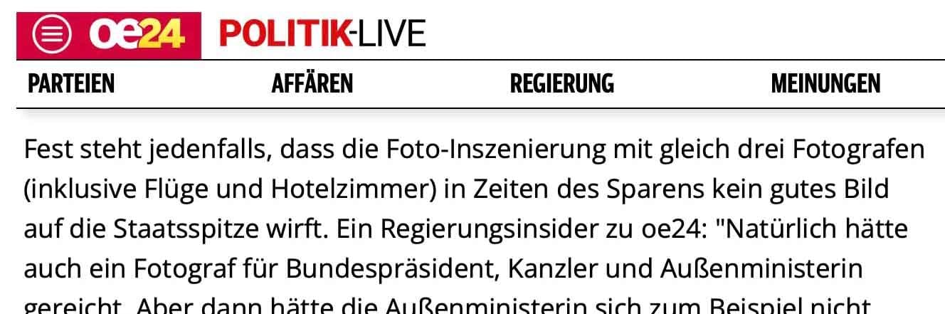 Jedenfalls sind die Pressefotografen in allen Artikeln sehr negativ geframed. Nach dem Motto: “wir Volk” wollen uns die nicht leisten, da reicht doch eine Person. Man kann streiten, ob diese Ausgabe jetzt Schuld am Budgetloch hat 🥴, aber OE24 schlägt dem Fass allerdings den Boden aus. In ihrem Artikel schreiben sie: